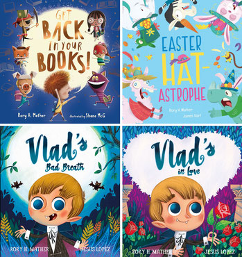 Thanks to special guest Rory H. Mather we have a fabulous prize to give away – a book pack including his picture books Get Back in Your Books and the Easter Hatastrophe published by Scholastic, and Vlad’s Bad Breath plus Vlad’s in Love, published by Larrikin House!